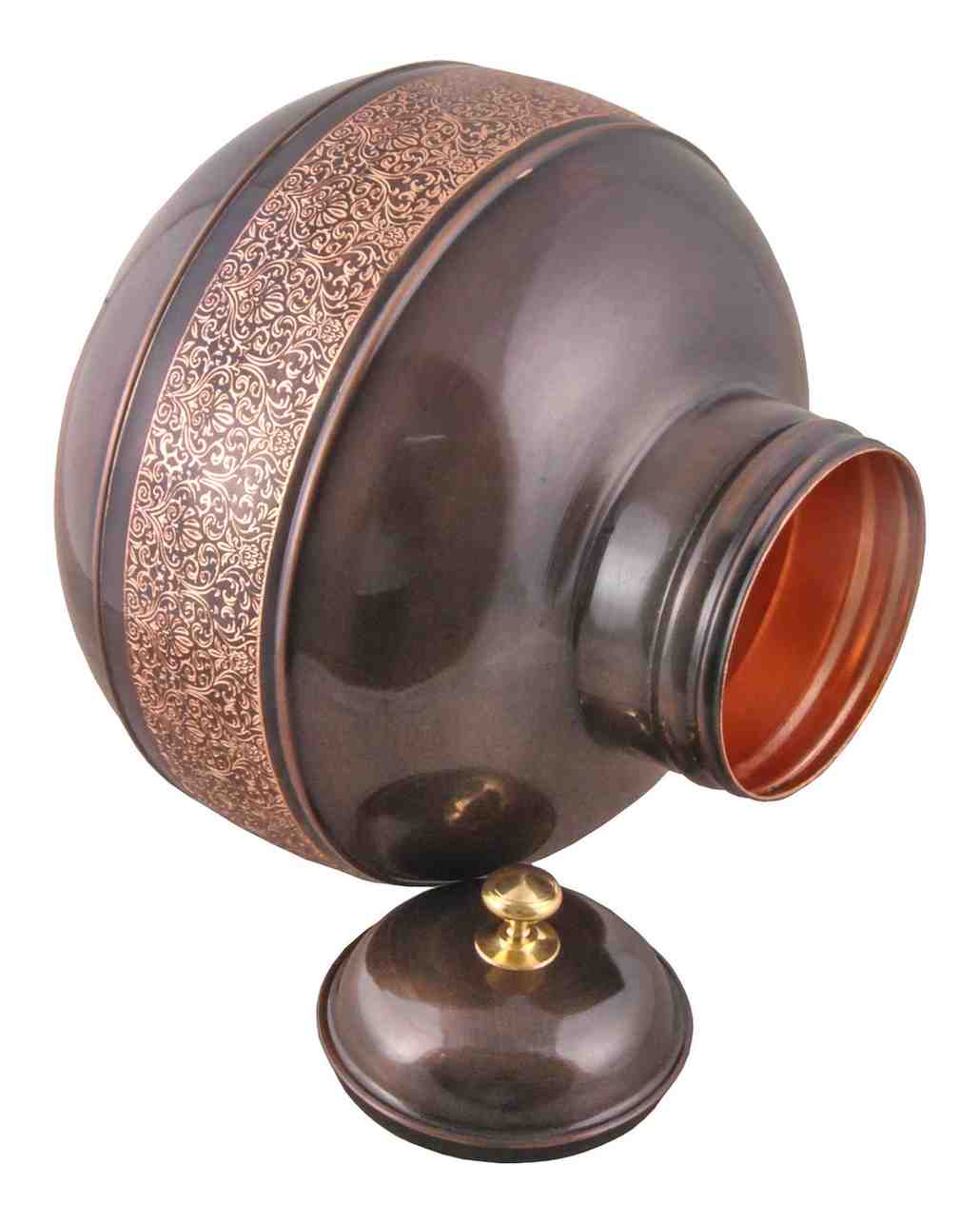 This pure copper water bottle with an elegant antique etched finish is designed for traditional Ayurvedic water storage and everyday